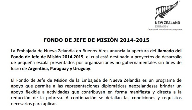 La Embajada de Nueva Zelandia en Buenos Aires tiene abierta la convocatoria para el Fondo Jefe de Misión 2014-2015 (HOMF) cuyo objetivo principal es brindar un apoyo flexible a actividades que contribuyan en forma manifiesta y directa a la reducción de la pobreza. La fecha de cierre es el 31 ...